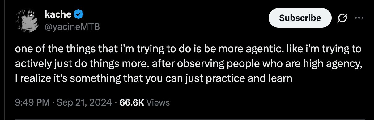 There’s a distinction between exercising agency and biasing towards action. Agency is about effecting change, which means taking actions that get results. “You can just do things” does not mean “go do anything.”